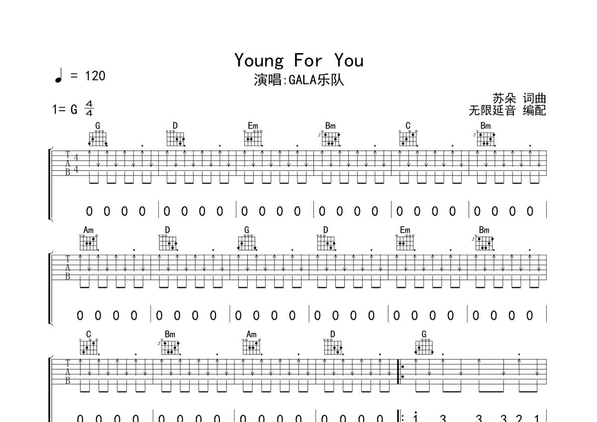 《Young For you》是GALA乐队演唱的一首歌曲,歌曲原调为G调,本吉他谱采用的是G调指法编配,演奏时不需要使用变调夹即为原调,这份吉他谱共有三张高清图谱,图谱由 @无限延音 编配上传,图谱使用六线谱编配,包含吉他和弦指法、简谱以及歌词部分,使用这份Young For you吉他谱,可以让你更加方便地掌握这首歌曲的弹唱技巧,快来尝试吧。