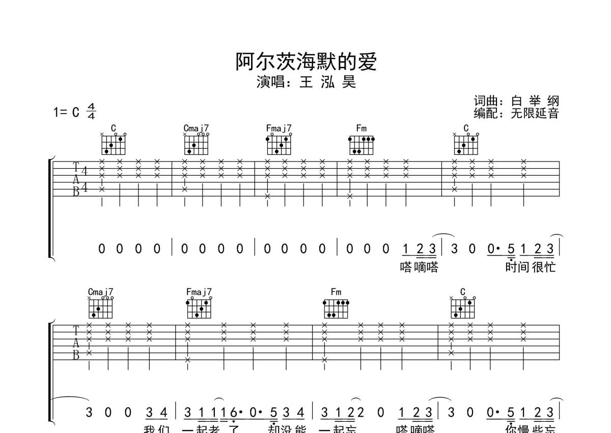 王泓昊《阿尔茨海默的爱》吉他谱 - C调弹唱六线谱