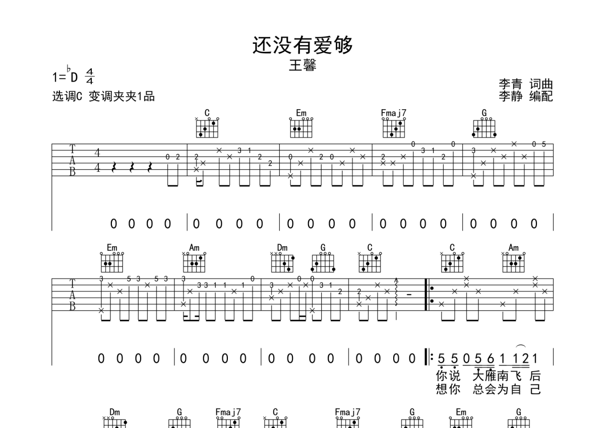 王馨《还没有爱够》吉他谱 - C调弹唱六线谱
