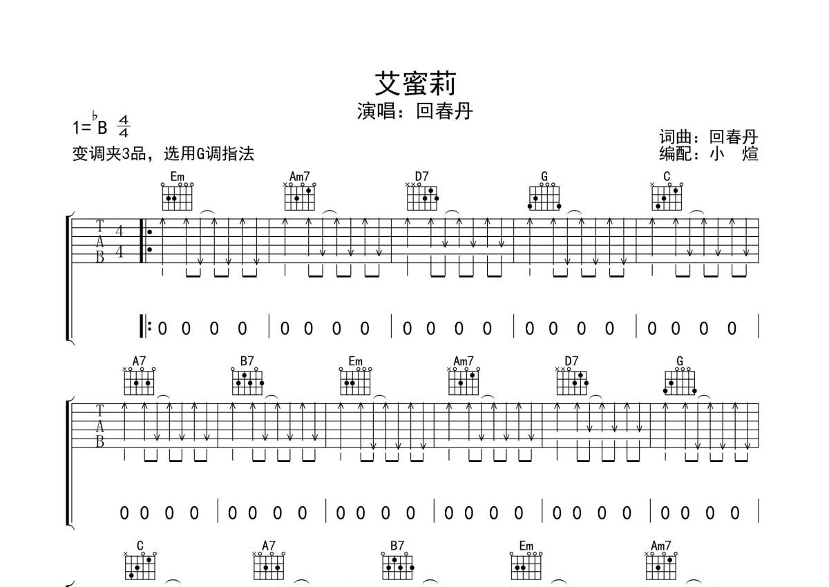 回春丹《艾蜜莉》吉他谱 - G调弹唱六线谱