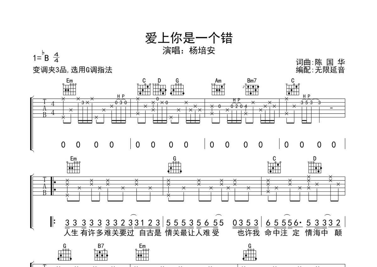 杨培安《爱上你是一个错》吉他谱 - G调弹唱六线谱