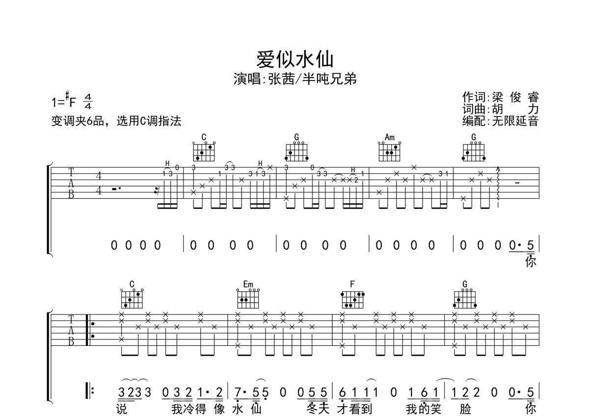 张茜/半吨兄弟《爱似水仙》吉他谱 - C调弹唱六线谱