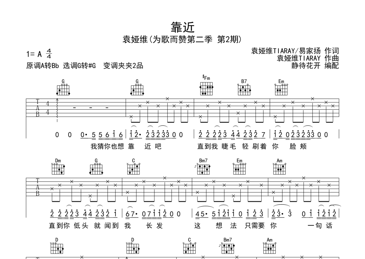 《靠近》是袁娅维TIA RAY演唱的一首歌曲,本吉他谱采用的是G调指法编配,这份吉他谱共有四张高清图谱,图谱由 @静待花开 编配上传,图谱使用六线谱编配,包含吉他和弦指法、简谱以及歌词部分,使用这份靠近吉他谱,可以让你更加方便地掌握这首歌曲的弹唱技巧,快来尝试吧。本谱采用G调和弦指法编配,节奏4/4拍,曲速85拍每分钟,弹唱建议变调夹夹2品,指法简单。