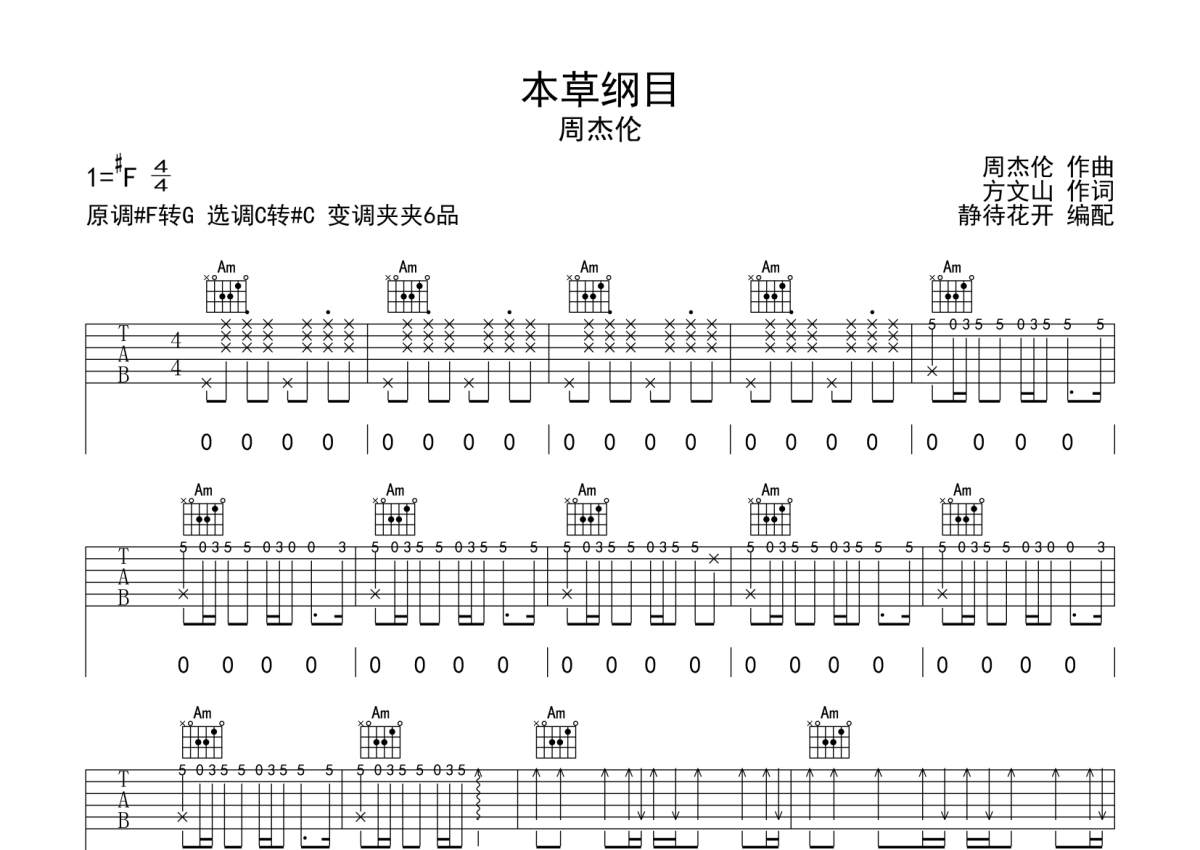 《本草纲目》是周杰伦演唱的一首歌曲,本吉他谱采用的是C调指法编配,这份吉他谱共有四张高清图谱,图谱由 @静待花开 编配上传,图谱使用六线谱编配,包含吉他和弦指法、简谱以及歌词部分,使用这份本草纲目吉他谱,可以让你更加方便地掌握这首歌曲的弹唱技巧,快来尝试吧。本谱采用C转#C调和弦指法编配,节奏4/4拍,曲速1OO拍每分钟,弹唱建议变调夹夹6品,指法简单。