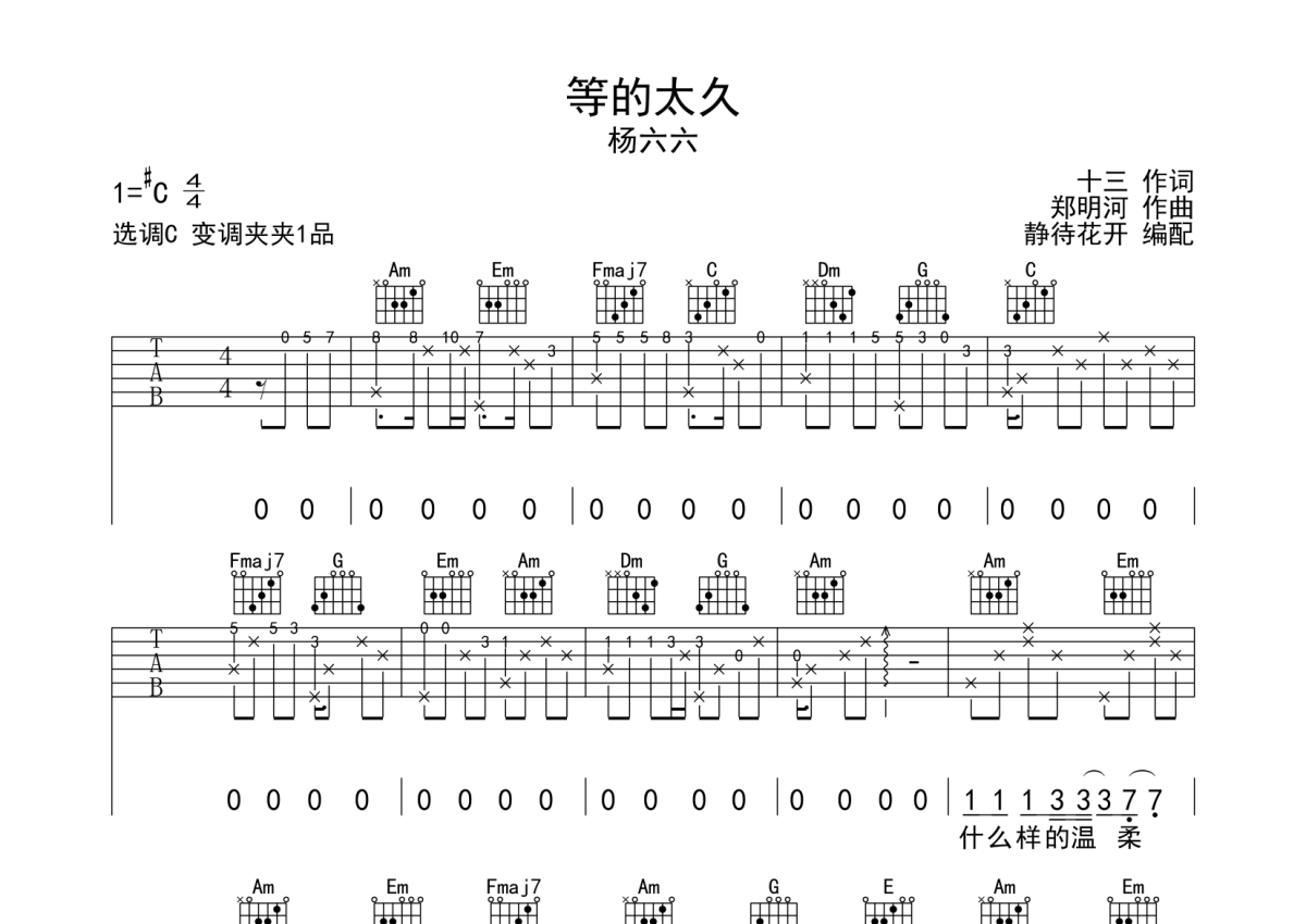 《等的太久》是杨六六演唱的一首歌曲,本吉他谱采用的是C调指法编配,这份吉他谱共有三张高清图谱,图谱由 @静待花开 编配上传,图谱使用六线谱编配,包含吉他和弦指法、简谱以及歌词部分,使用这份等的太久吉他谱,可以让你更加方便地掌握这首歌曲的弹唱技巧,快来尝试吧。本谱采用C调和弦指法编配,节奏4/4拍,曲速85拍每分钟,弹唱建议变调夹夹1品,指法简单。