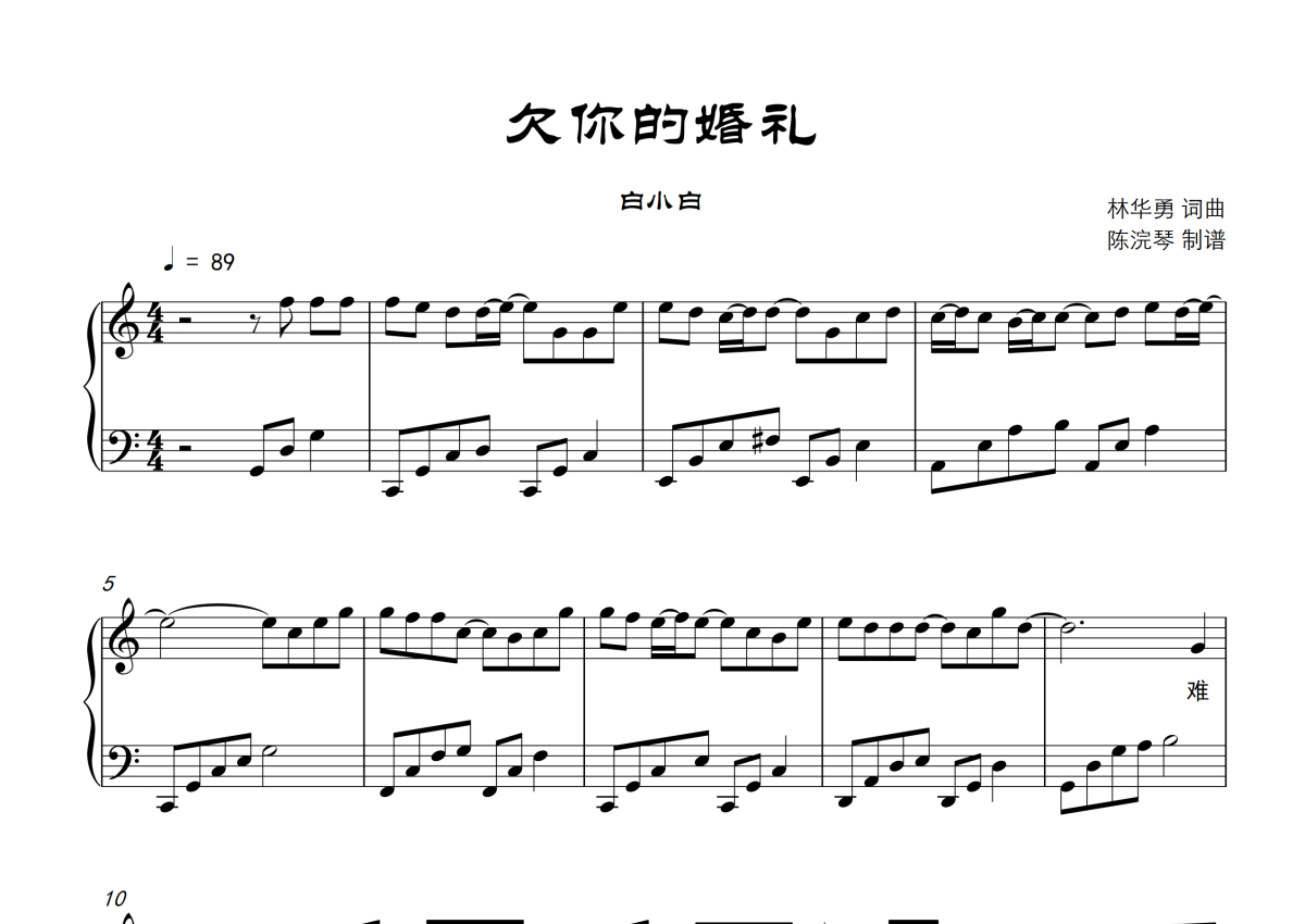 白小白《欠你的婚礼》钢琴谱 - C调钢琴谱,附歌词