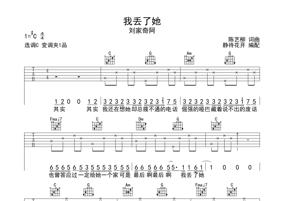 刘家奇阿《我丢了她》吉他谱 - C调弹唱六线谱