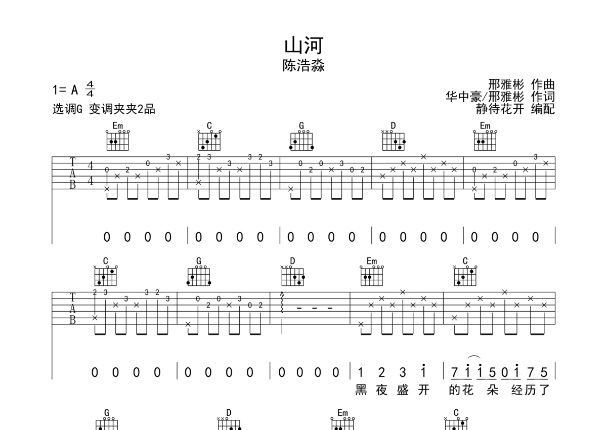 陈浩淼《山河》吉他谱 - G调弹唱六线谱