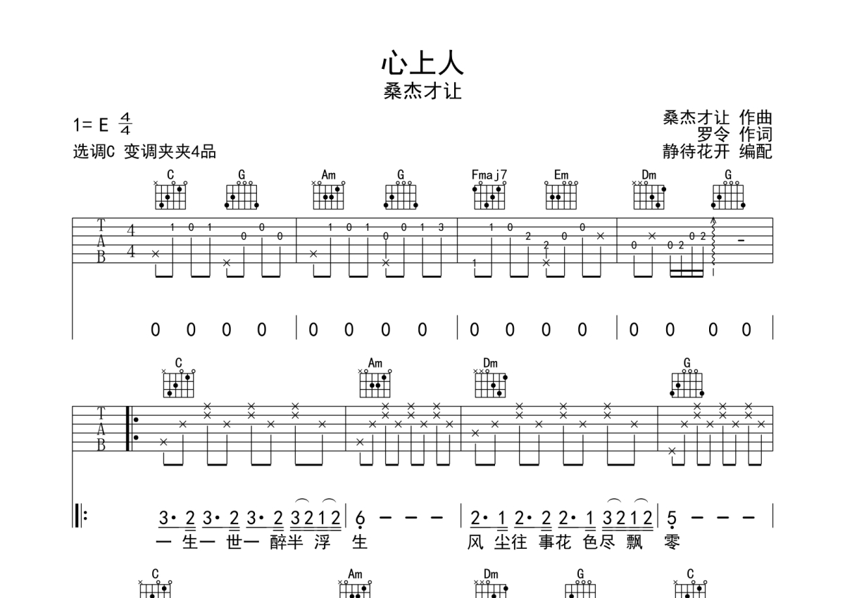 《心上人》是桑杰才让演唱的一首歌曲,本吉他谱采用的是C调指法编配,这份吉他谱共有两张高清图谱,图谱由 @静待花开 编配上传,图谱使用六线谱编配,包含吉他和弦指法、简谱以及歌词部分,使用这份心上人吉他谱,可以让你更加方便地掌握这首歌曲的弹唱技巧,快来尝试吧。本谱采用C调和弦指法编配,节奏4/4拍,曲速70拍每分钟,弹唱建议变调夹夹4品,指法简单。