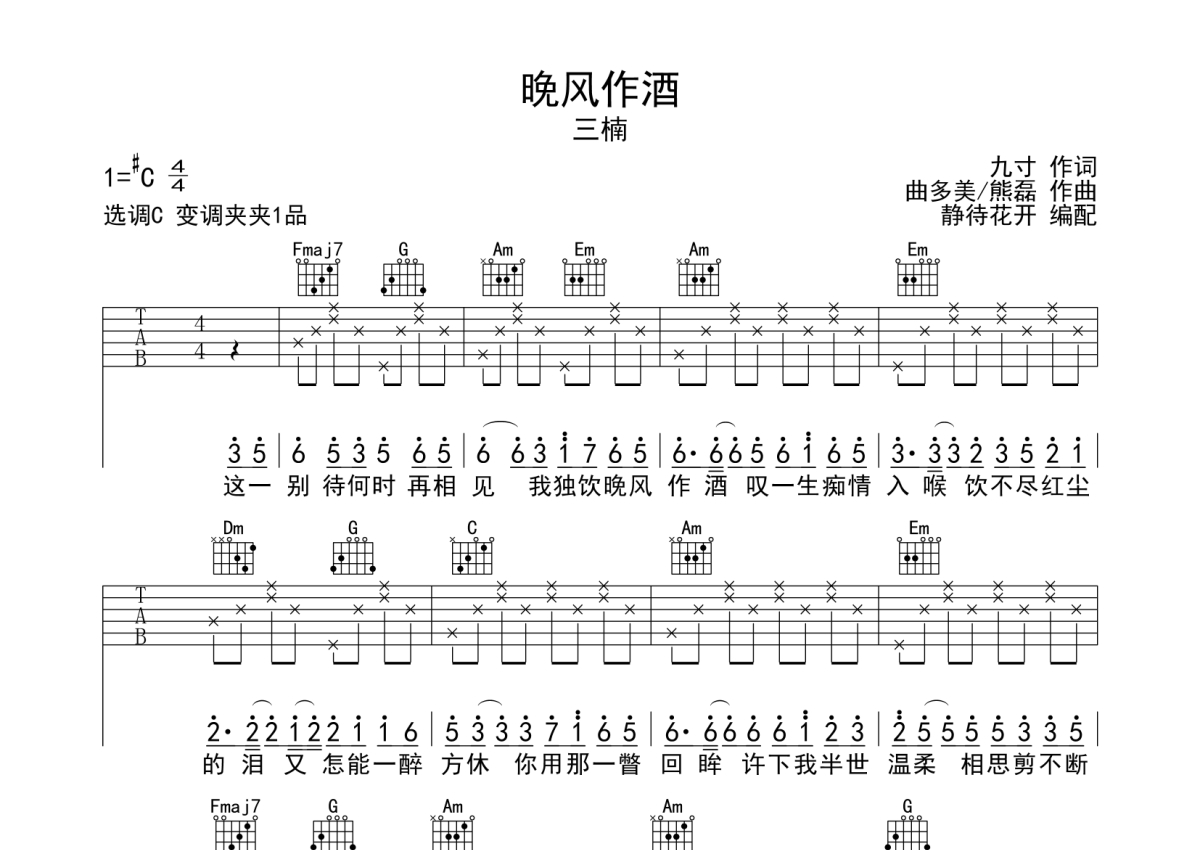 三楠《晚风作酒》吉他谱 - C调弹唱六线谱