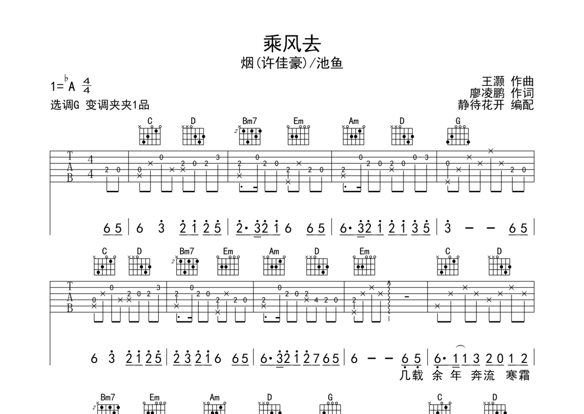 烟(许佳豪)/池鱼《乘风去》吉他谱 - G调弹唱六线谱