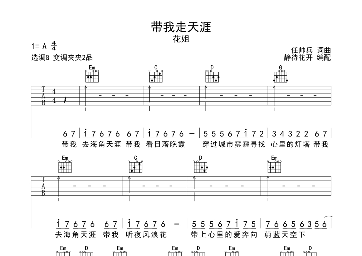 《带我走天涯》是花姐演唱的一首歌曲,本吉他谱采用的是G调指法编配,这份吉他谱共有三张高清图谱,图谱由 @静待花开 编配上传,图谱使用六线谱编配,包含吉他和弦指法、简谱以及歌词部分,使用这份带我走天涯吉他谱,可以让你更加方便地掌握这首歌曲的弹唱技巧,快来尝试吧。本谱采用G调和弦指法编配,节奏4/4拍,曲速110拍每分钟,弹唱建议变调夹夹2品,指法简单。