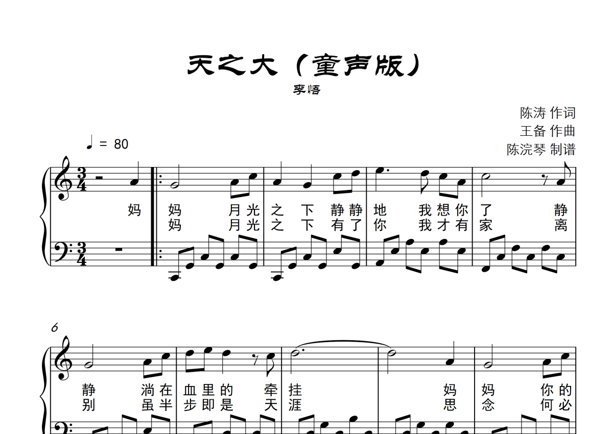 《天之大》是李悟演唱的一首歌曲,(童声版)C调钢琴谱,附歌词,这份钢琴谱共有两张高清图谱,图谱由 @月隐云先知 编配上传,曲谱配备了相关的音频提供试听,使用这份天之大钢琴谱,可以让你更加方便地掌握这首歌曲的演奏技巧,快来尝试吧。