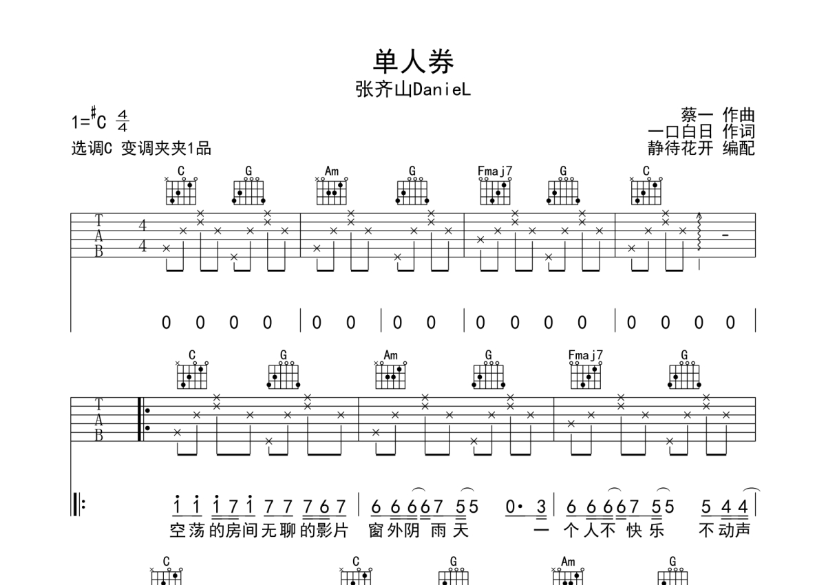 张齐山DanieL《单人券》吉他谱 - C调弹唱六线谱