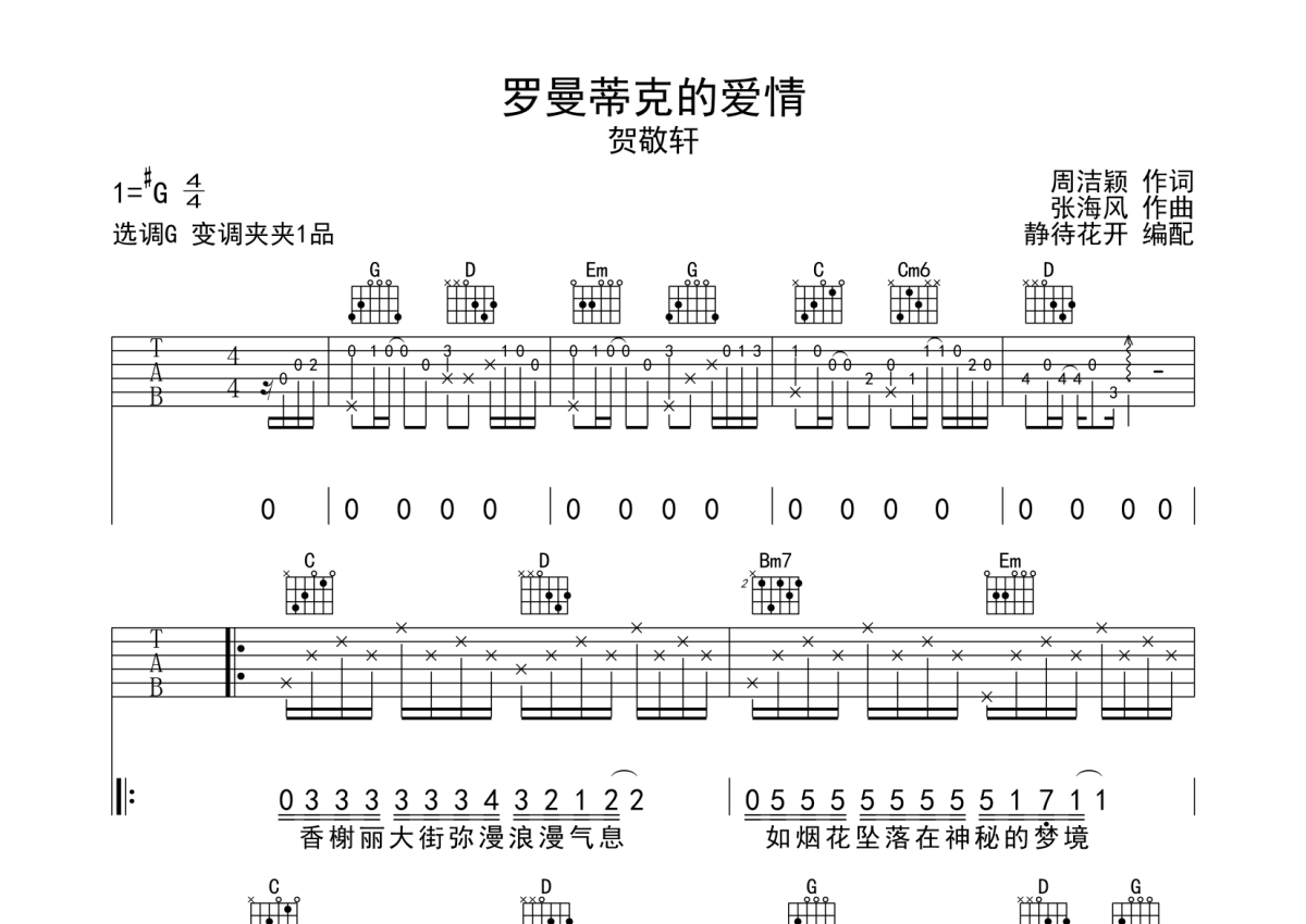 贺敬轩《罗曼蒂克的爱情》吉他谱 - G调弹唱六线谱