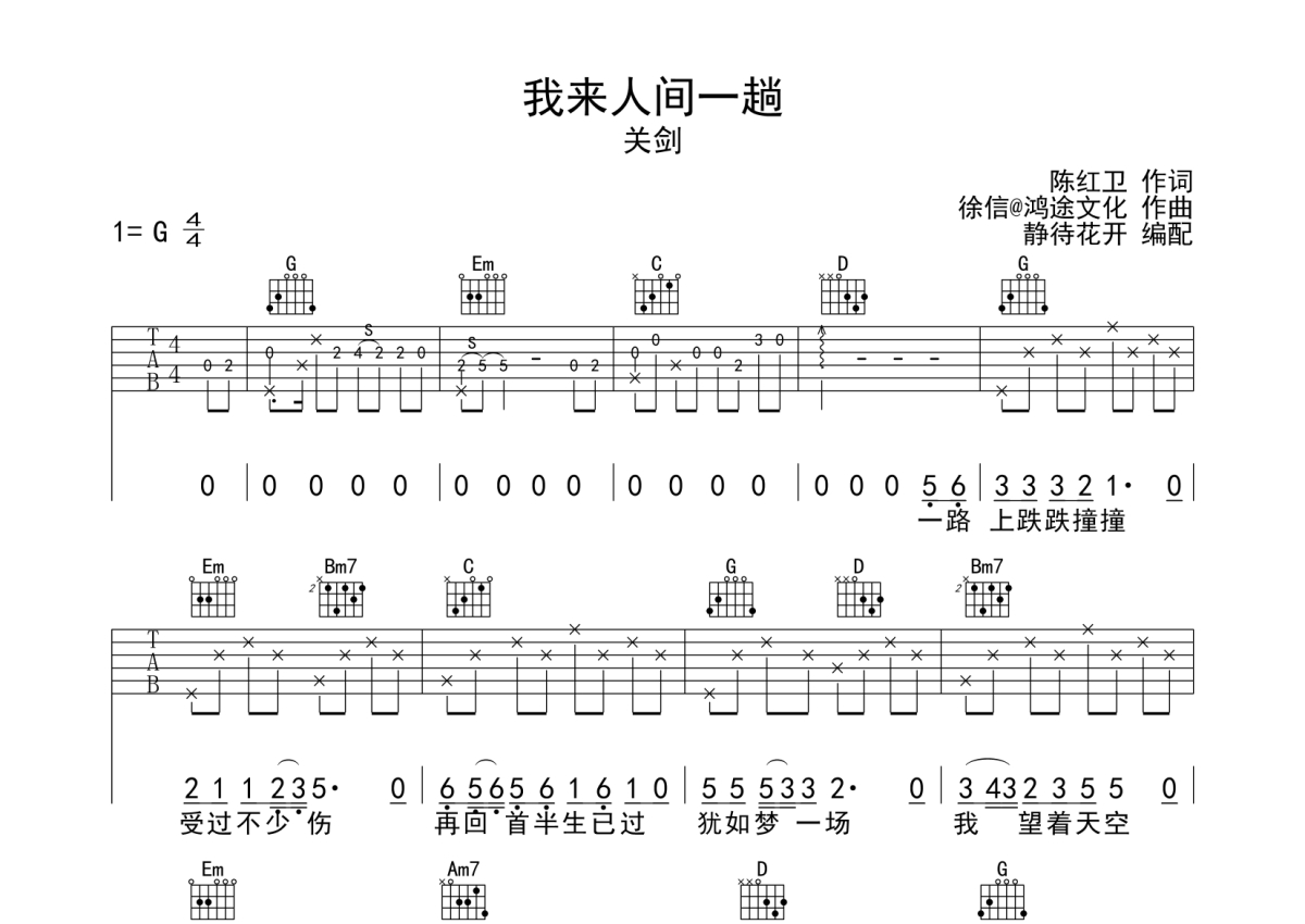 关剑《我来人间一趟》吉他谱 - G调弹唱六线谱