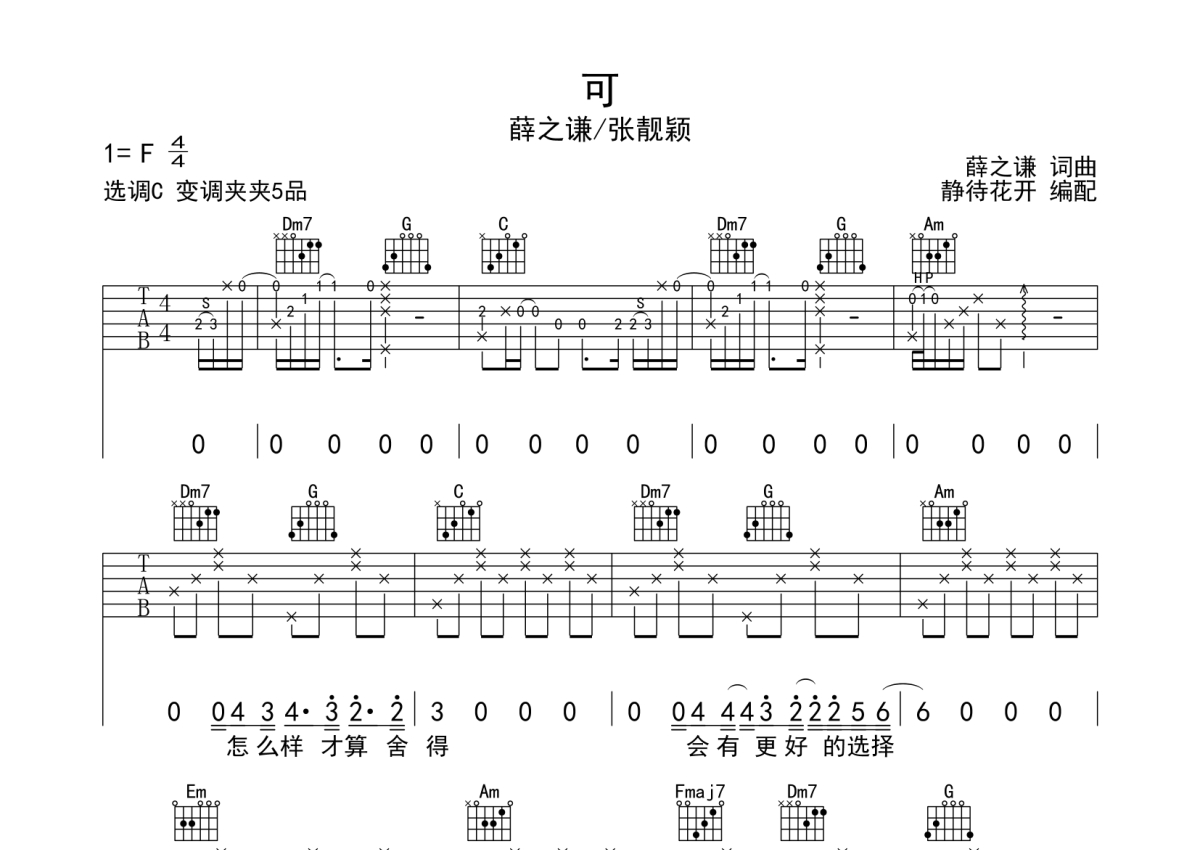 薛之谦/张靓颖《可》吉他谱 - C调弹唱六线谱