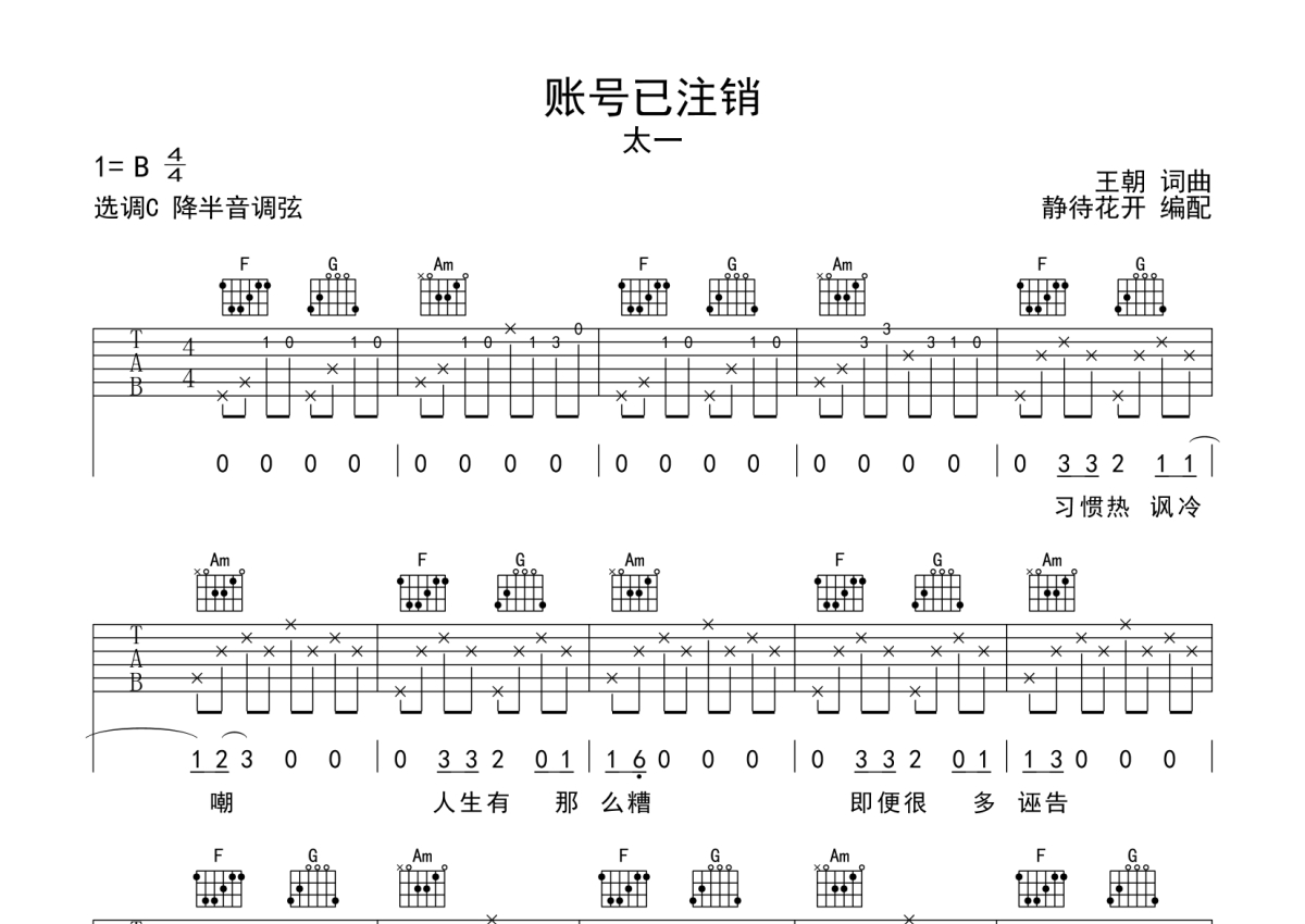 《账号已注销》是太一演唱的一首歌曲,本吉他谱采用的是C调指法编配,这份吉他谱共有三张高清图谱,图谱由 @静待花开 编配上传,图谱使用六线谱编配,包含吉他和弦指法、简谱以及歌词部分,使用这份账号已注销吉他谱,可以让你更加方便地掌握这首歌曲的弹唱技巧,快来尝试吧。本吉他谱采用C调指法编配,来自@静待花开编配制作,演奏降半音调弦,原调B调,也可以根据个人嗓音条件灵活选择变调夹,演奏的速度控制在每分钟85拍左右,演奏难度简单。