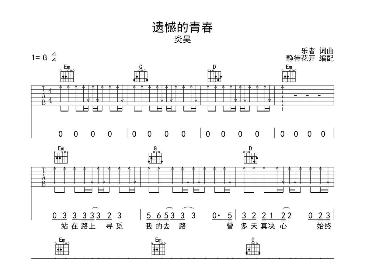 炎昊《遗憾的青春》吉他谱 - G调弹唱六线谱