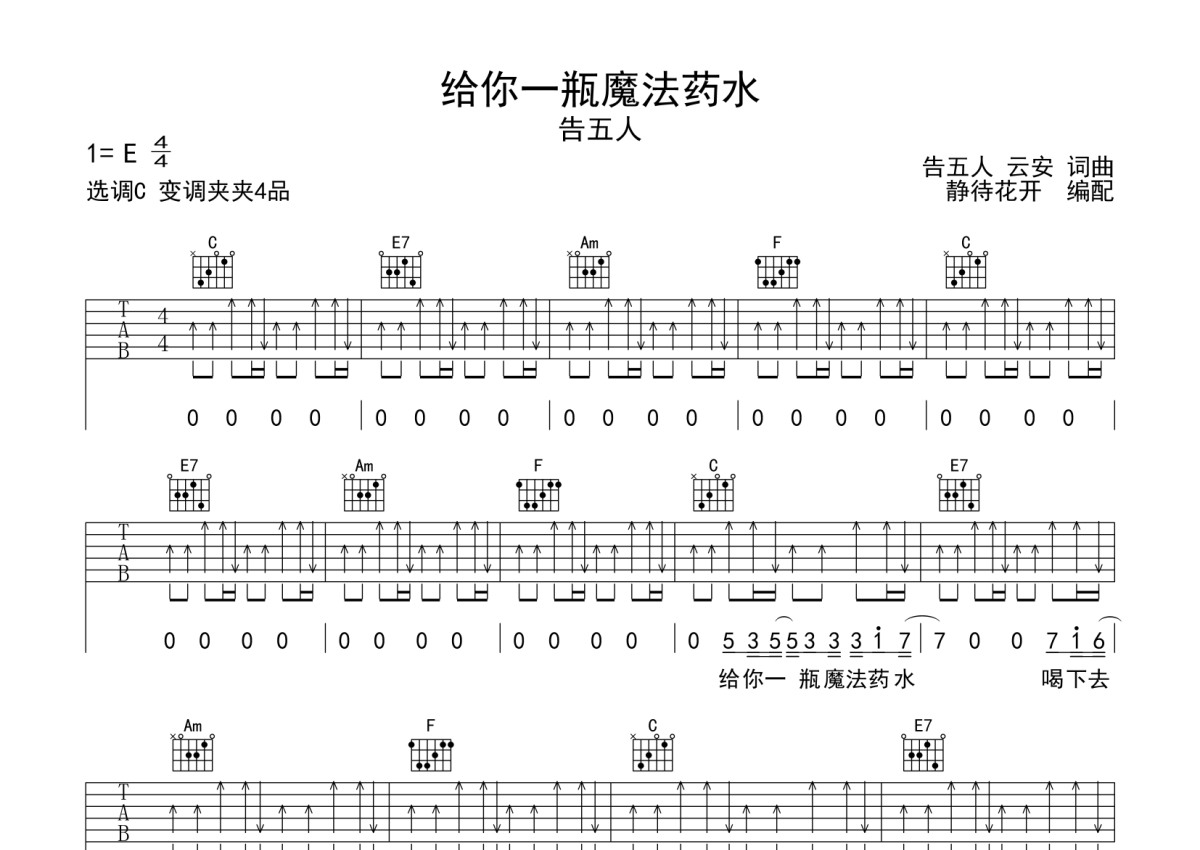 《给你一瓶魔法药水》是告五人演唱的一首歌曲,本吉他谱采用的是C调指法编配,这份吉他谱共有四张高清图谱,图谱由 @静待花开 编配上传,图谱使用六线谱编配,包含吉他和弦指法、简谱以及歌词部分,使用这份给你一瓶魔法药水吉他谱,可以让你更加方便地掌握这首歌曲的弹唱技巧,快来尝试吧。本吉他谱采用C调和弦指法编配,推荐变调夹夹第4品演奏,原调E调,也可以根据个人嗓音条件灵活选择变调夹位置,演奏的速度控制在每分钟85拍左右,演奏难度简单。