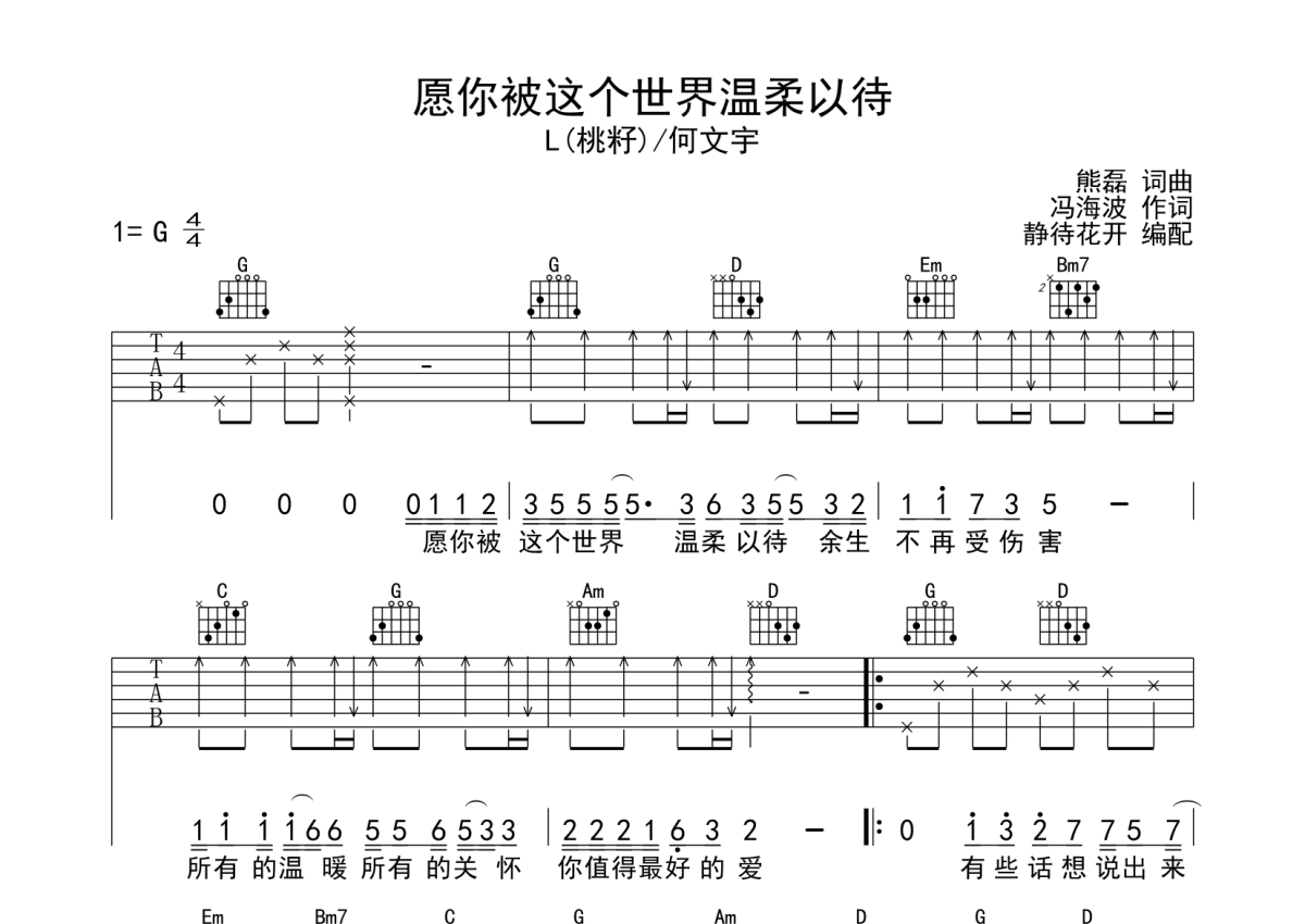 L(桃籽)/何文宇《愿你被这个世界温柔以待》吉他谱 - G调弹唱六线谱