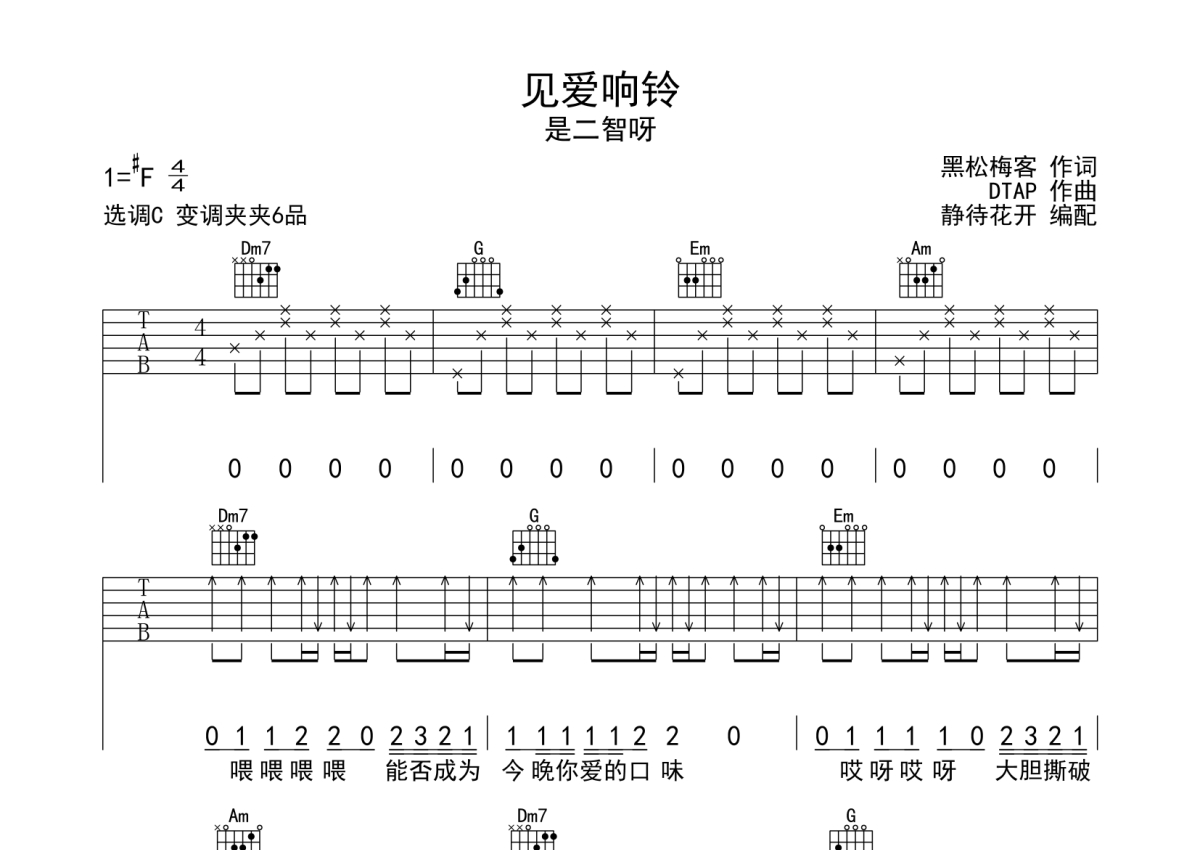 《见爱响铃》是是二智呀演唱的一首歌曲,本吉他谱采用的是C调指法编配,这份吉他谱共有三张高清图谱,图谱由 @静待花开 编配上传,图谱使用六线谱编配,包含吉他和弦指法、简谱以及歌词部分,使用这份见爱响铃吉他谱,可以让你更加方便地掌握这首歌曲的弹唱技巧,快来尝试吧。来自@静待花开编配扒谱制作,本吉他谱采用C调和弦指法编配,推荐变调夹夹第6品演奏,原调#F调,也可以根据个人嗓音条件灵活选择变调夹位置,演奏的速度控制在每分钟85拍左右,演奏难度简单。