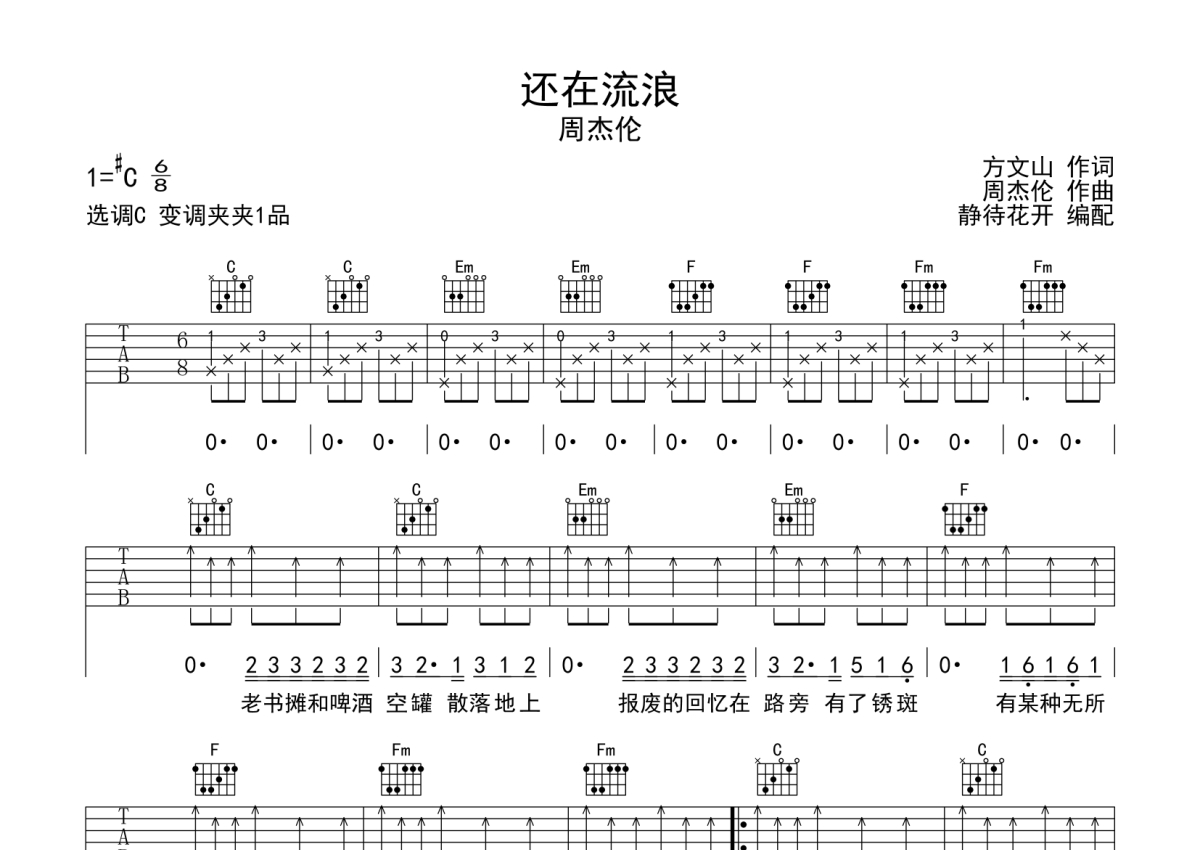 周杰伦《还在流浪》吉他谱 - C调弹唱六线谱