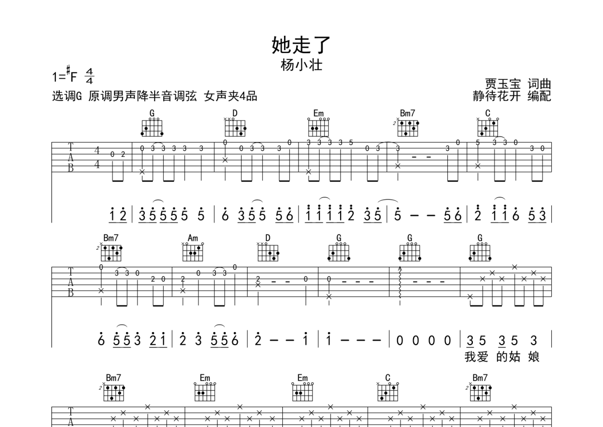 杨小壮《她走了》吉他谱 - G调弹唱六线谱