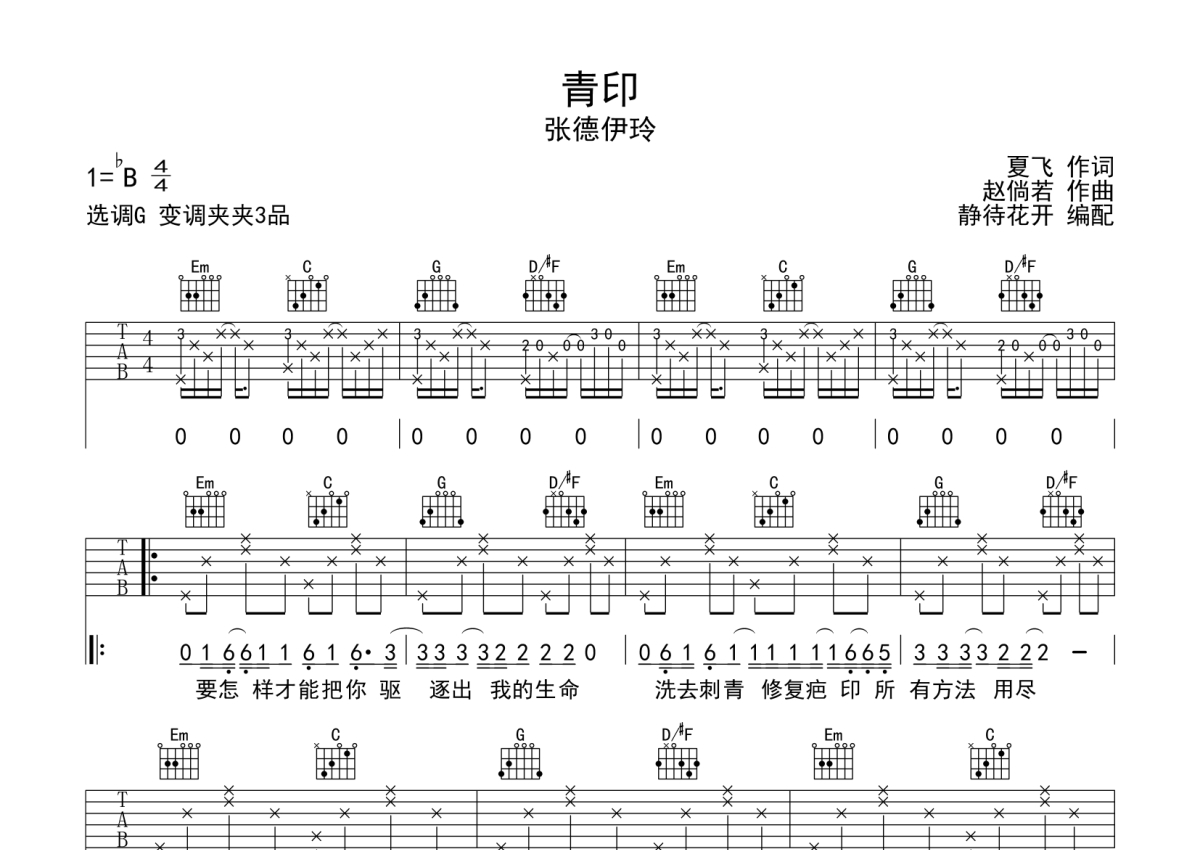 张德伊玲《青印》吉他谱 - G调弹唱六线谱