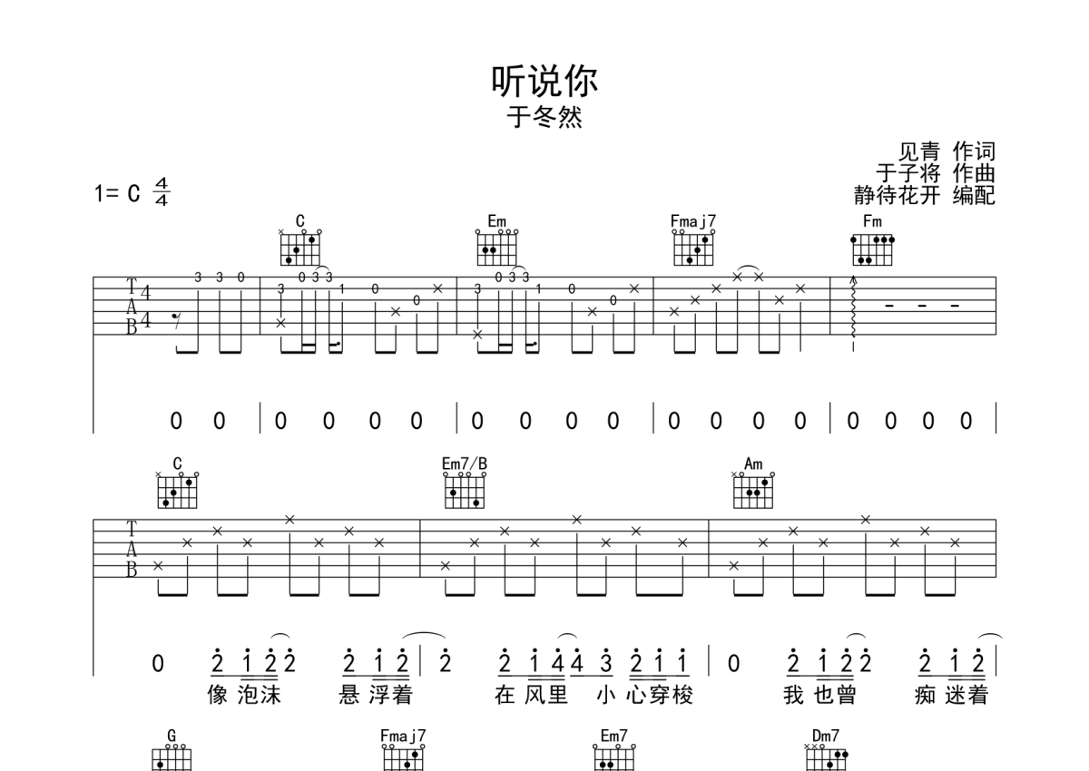于冬然《听说你》吉他谱 - C调弹唱六线谱