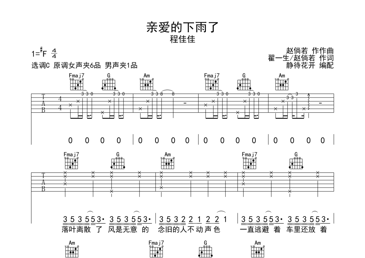 程佳佳《亲爱的下雨了》吉他谱 - C调弹唱六线谱