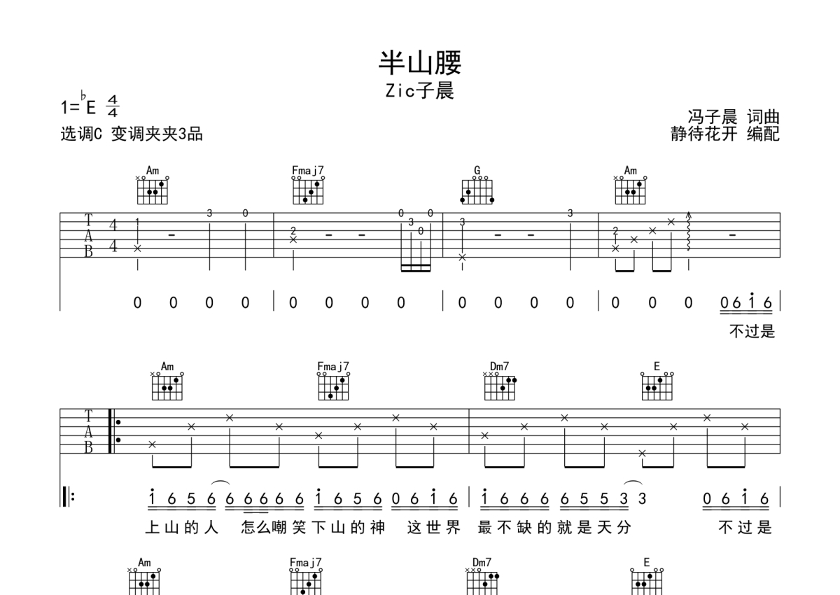 Zic子晨《半山腰》吉他谱 - C调弹唱六线谱