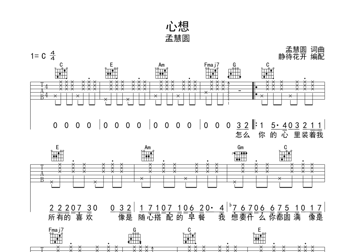 孟慧圆《心想》吉他谱 - C调弹唱六线谱