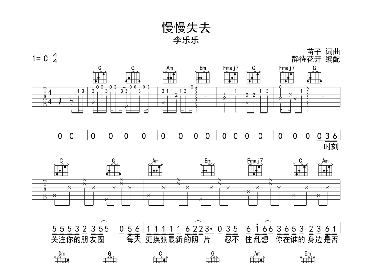 李乐乐《慢慢失去》吉他谱 - C调弹唱六线谱