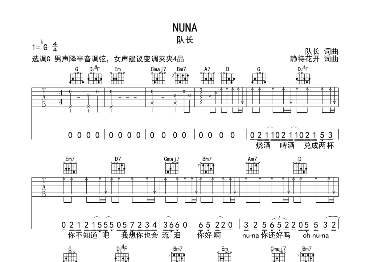 队长《NUNA》吉他谱 - G调弹唱六线谱