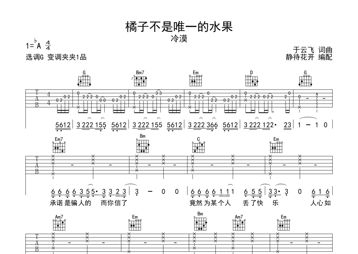 《橘子不是唯一的水果》是冷漠演唱的一首歌曲,本吉他谱采用的是G调指法编配,这份吉他谱共有两张高清图谱,图谱由 @静待花开 编配上传,图谱使用六线谱编配,包含吉他和弦指法、简谱以及歌词部分,使用这份橘子不是唯一的水果吉他谱,可以让你更加方便地掌握这首歌曲的弹唱技巧,快来尝试吧。来自@静待花开编配扒谱制作,本吉他谱采用G调和弦指法编配,推荐变调夹夹第1品演奏,原调bA调,也可以根据个人嗓音条件灵活选择变调夹位置,演奏的速度控制在每分钟80拍左右,演奏难度简单。