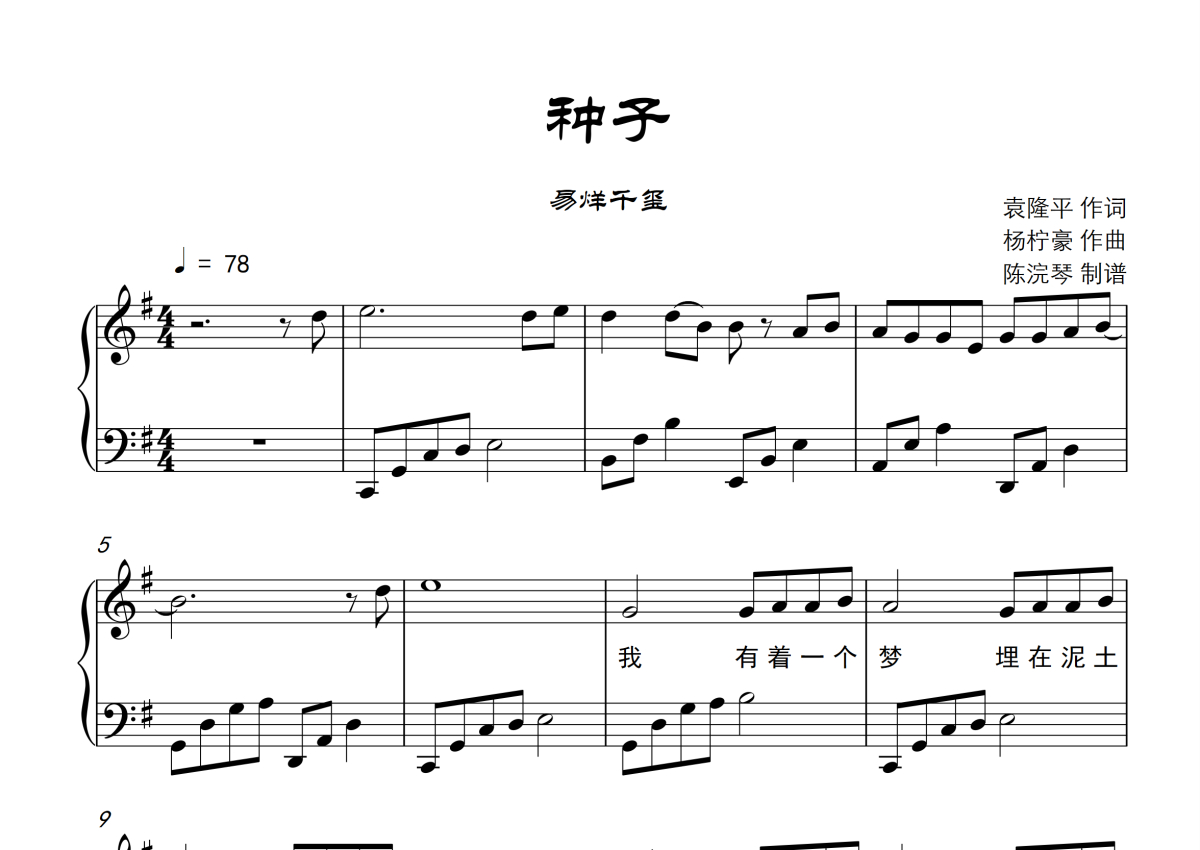 易烊千玺《种子》钢琴谱 - G调钢琴谱,附歌词