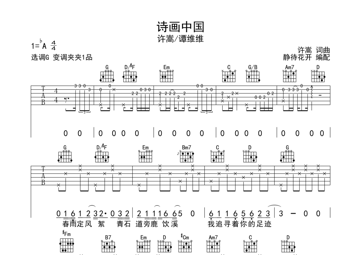 许嵩/谭维维《诗画中国》吉他谱 - G调弹唱六线谱