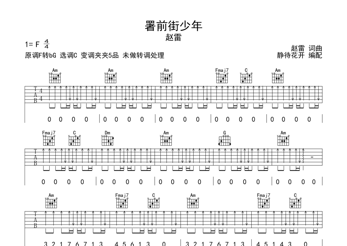 赵雷《署前街少年》吉他谱 - C调弹唱六线谱