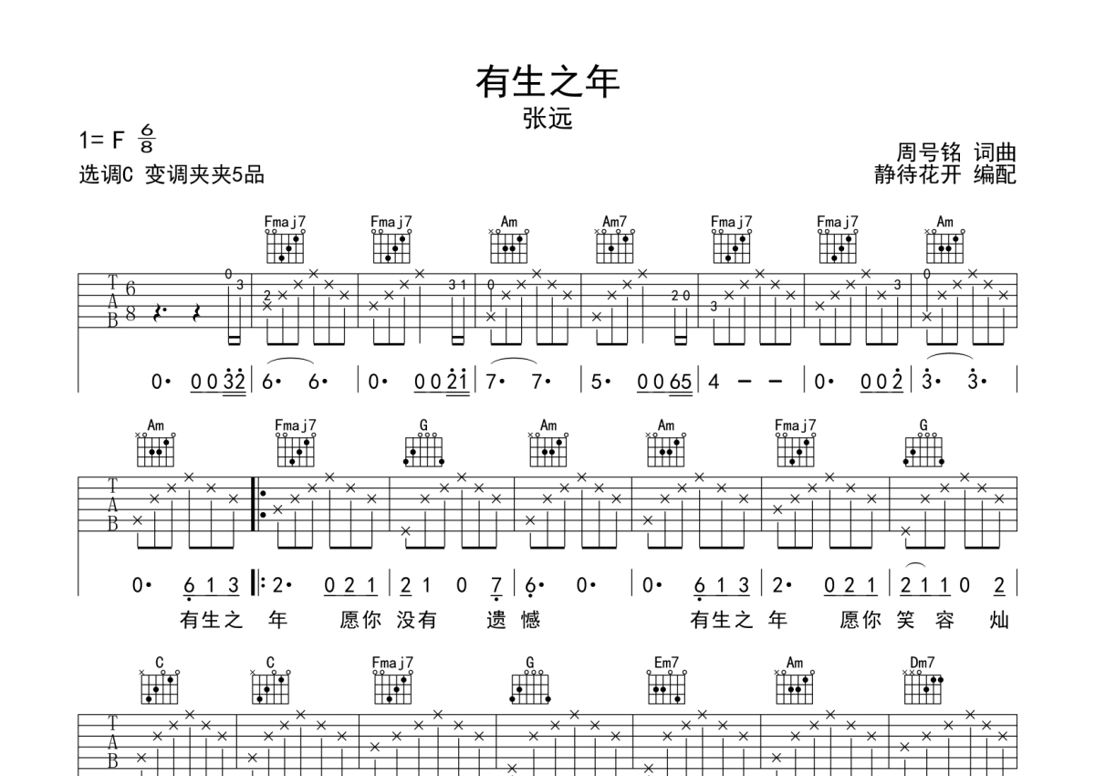 张远《有生之年》吉他谱 - C调弹唱六线谱