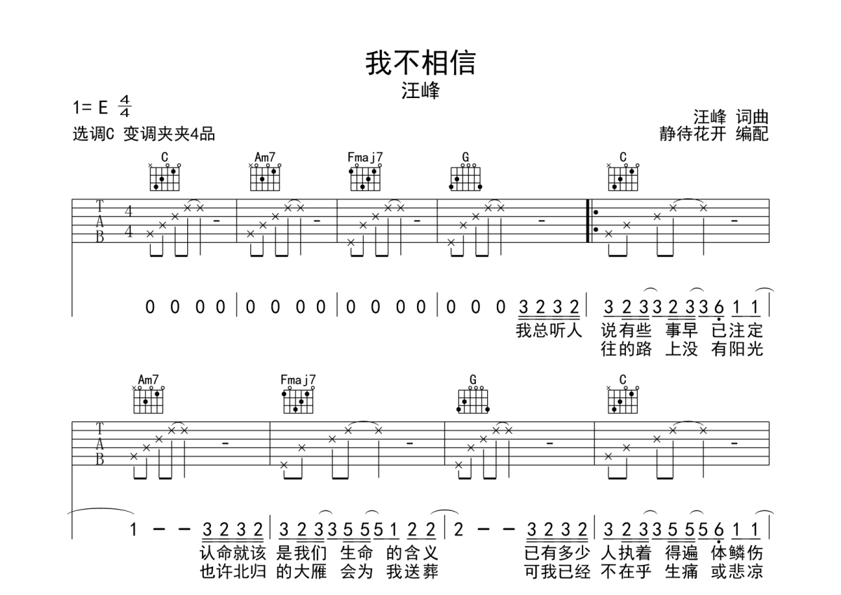 《我不相信》是汪峰演唱的一首歌曲,本吉他谱采用的是C调指法编配,这份吉他谱共有三张高清图谱,图谱由 @静待花开 编配上传,图谱使用六线谱编配,包含吉他和弦指法、简谱以及歌词部分,使用这份我不相信吉他谱,可以让你更加方便地掌握这首歌曲的弹唱技巧,快来尝试吧。来自@静待花开编配扒谱制作,本吉他谱采用C调和弦指法编配,推荐变调夹夹第4品演奏,原调E调,也可以根据个人嗓音条件灵活选择变调夹位置,演奏的速度控制在每分钟75拍左右,演奏难度简单。