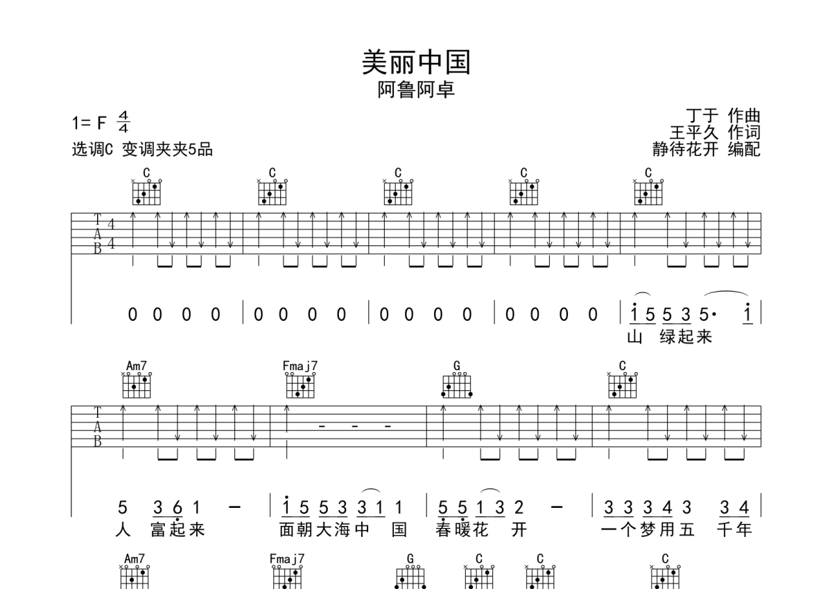 阿鲁阿卓《美丽中国》吉他谱 - C调弹唱六线谱
