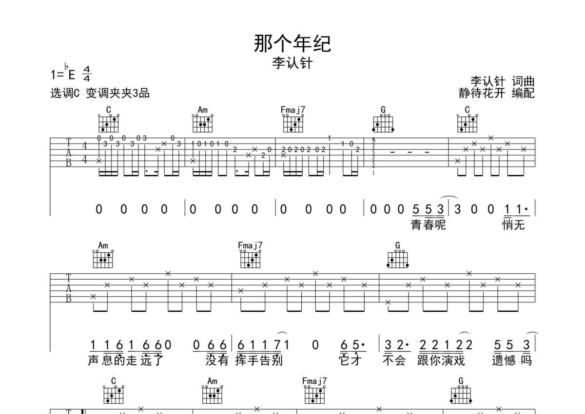 李认针《那个年纪》吉他谱 - C调弹唱六线谱