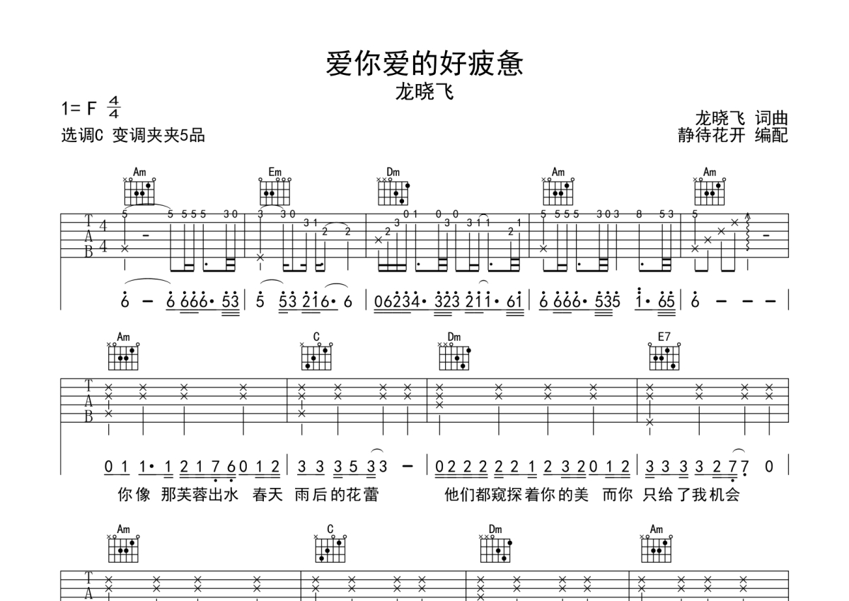 龙晓飞《爱你爱的好疲惫》吉他谱 - C调弹唱六线谱