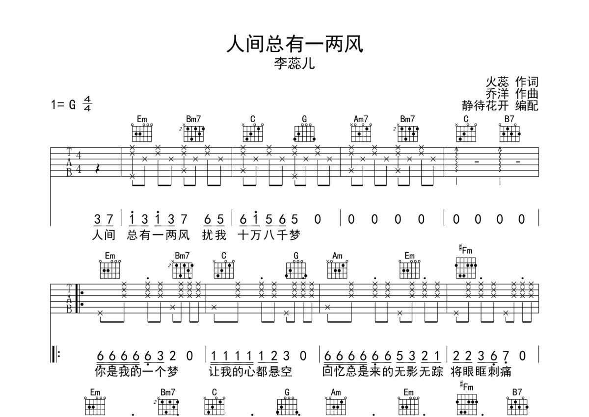 李蕊儿《人间总有一两风》吉他谱 - G调弹唱六线谱