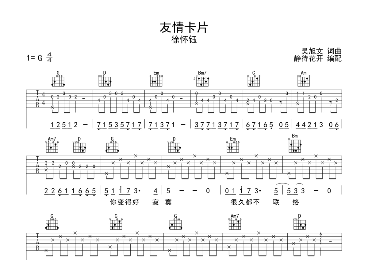 徐怀钰《友情卡片》吉他谱 - G调弹唱六线谱