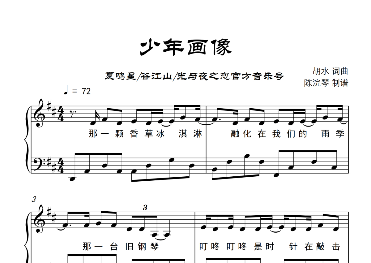 夏鸣星 /谷江山 /光与夜之恋官方音乐号《少年画像》钢琴谱 - D调钢琴谱,附歌词