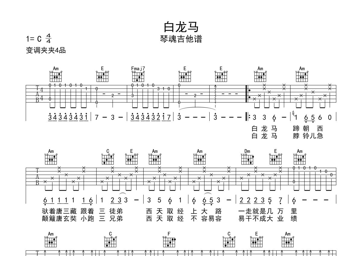 《白龙马》是西游记演唱的一首歌曲,本吉他谱采用的是C调指法编配,这份吉他谱共有一张高清图谱,图谱由 @漁乙 编配上传,图谱使用六线谱编配,包含吉他和弦指法、简谱以及歌词部分,使用这份白龙马吉他谱,可以让你更加方便地掌握这首歌曲的弹唱技巧,快来尝试吧。