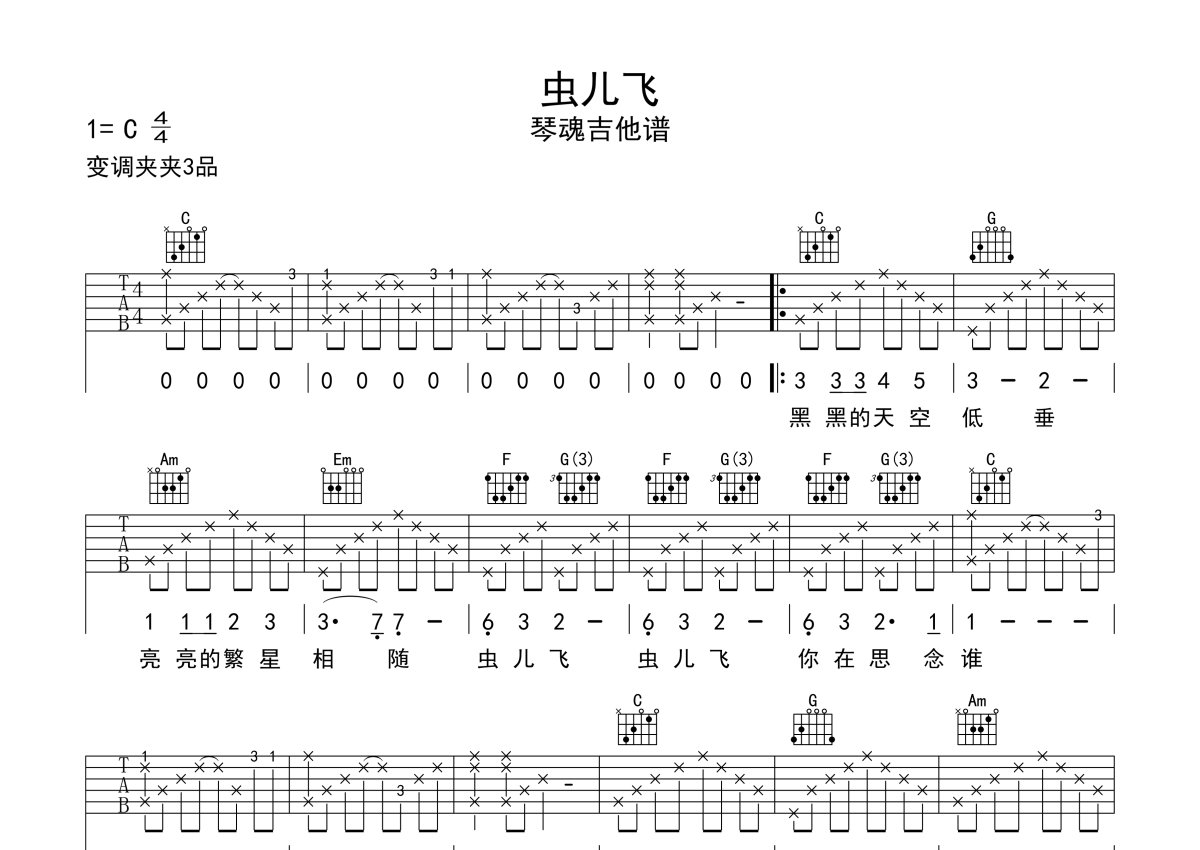 儿歌《虫儿飞》吉他谱 - C调弹唱六线谱