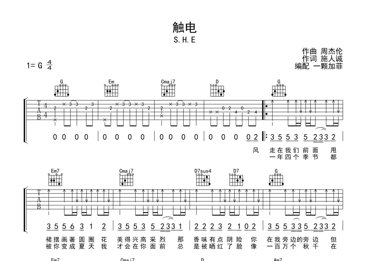 《触电》是SHE演唱的一首歌曲,完整编配版,本吉他谱采用的是G调指法编配,这份吉他谱共有三张高清图谱,图谱由 @一颗加菲 编配上传,图谱使用六线谱编配,包含吉他和弦指法、简谱以及歌词部分,曲谱配备了相关的音频提供试听,使用这份触电吉他谱,可以让你更加方便地掌握这首歌曲的弹唱技巧,快来尝试吧。